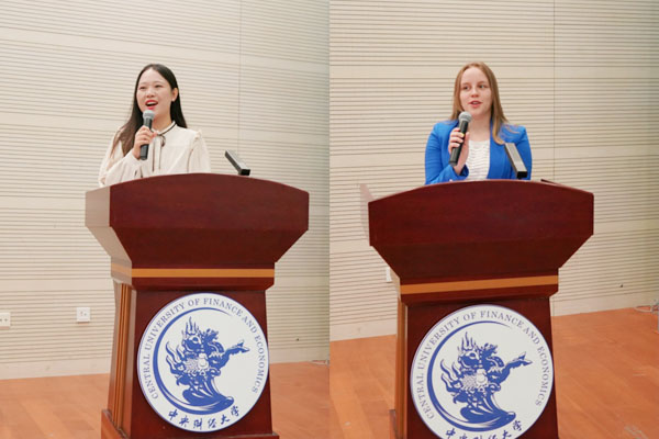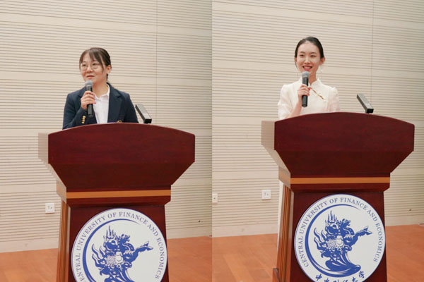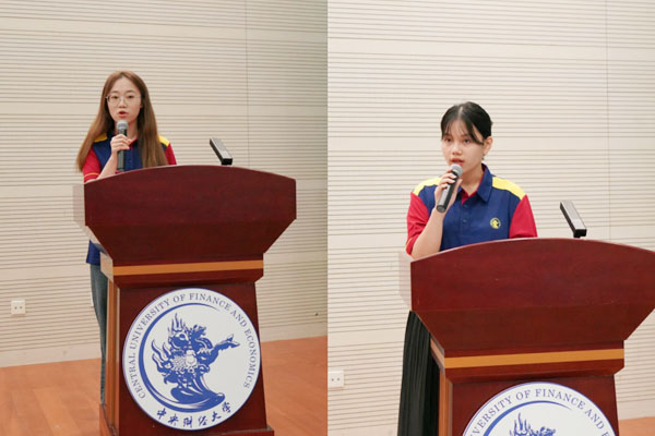接着,在校生代表--2022级汉语国际教育硕士专业学位研究生姚萌琦和2020级国际经济与贸易学院本科留学生刘爱珍发言。姚萌琦分享了自己在中财学习和去希腊色萨利大学孔子学院担任汉语教师志愿者的经历和心路历程,并分享了三个关键词给新生:沉淀、探索和快乐。刘爱珍感谢了来到我校后老师和同学们对她的帮助,同时也分享了自己入学以来的生活和学习感受,向新生同学们分享了学习和生活方面的建议。