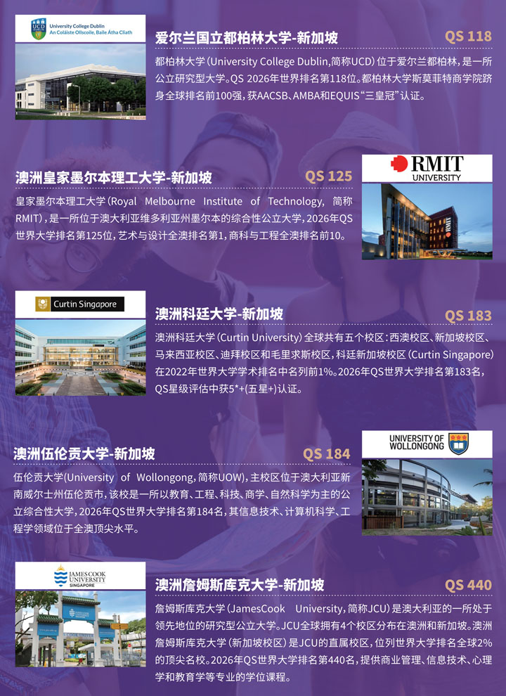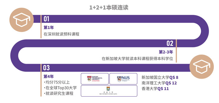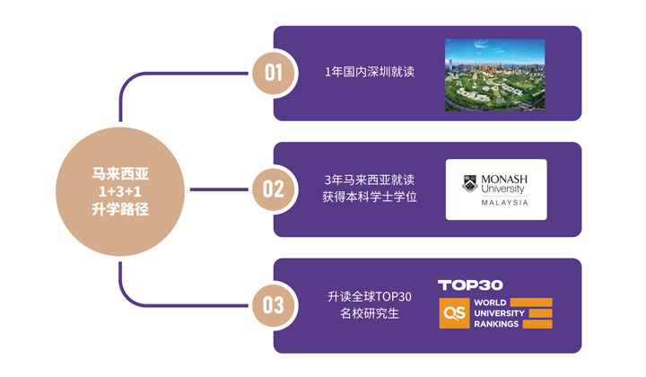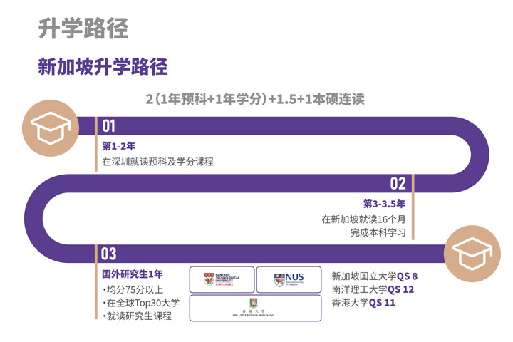 马来西亚、新加坡院校深度合作定向培养,海外院校全球化升学;学生完成国内课程达到海外院校入学要求,100%确保入学名额;升学海外合作院校均受中国教育部认可,学成归国后学位均可获中国教育部认证,享受留学生多项待遇。