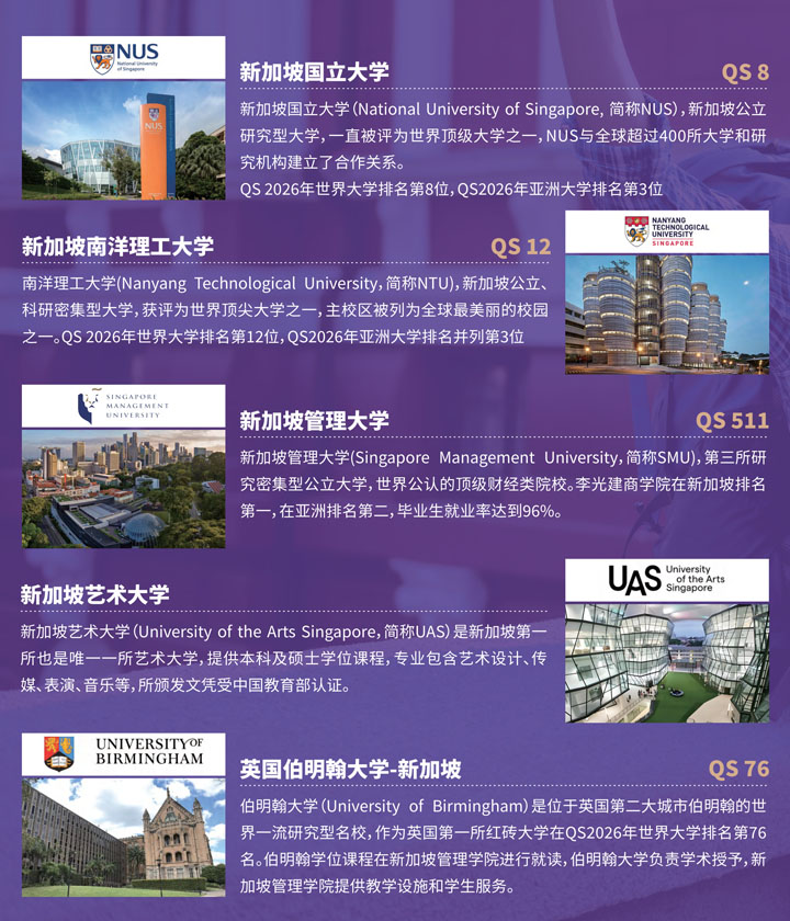 新加坡教育是公认的亚洲素质教育强国,其教育制度沿袭了英国的教育制度,且新加坡是留学圈著名的“黄金跳板”,直通欧美澳等国。新加坡的高校数量虽然不多,但却不乏世界名校。