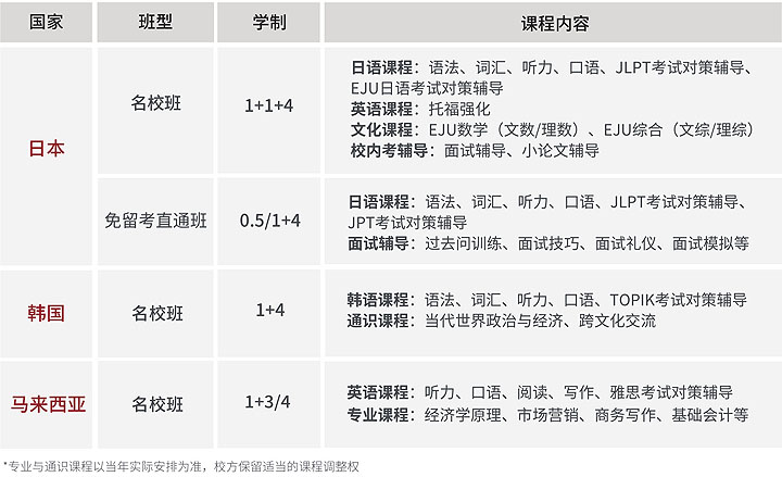 - 免留考直通班:帝京大学、城西国际大学、樱美林大学、京都外国语大学、帝京平成大学、鹿儿岛国际大学、冈山商科大学、大阪观光大学、新泻产业大学、关西国际大学、山梨学院大学、育英馆大学、神户国际大学、流通科学大学、武藏野学院大学等