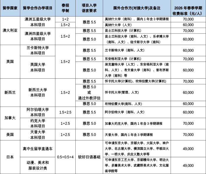 除日本项目外,其他均为学分豁免(2+2)项目。