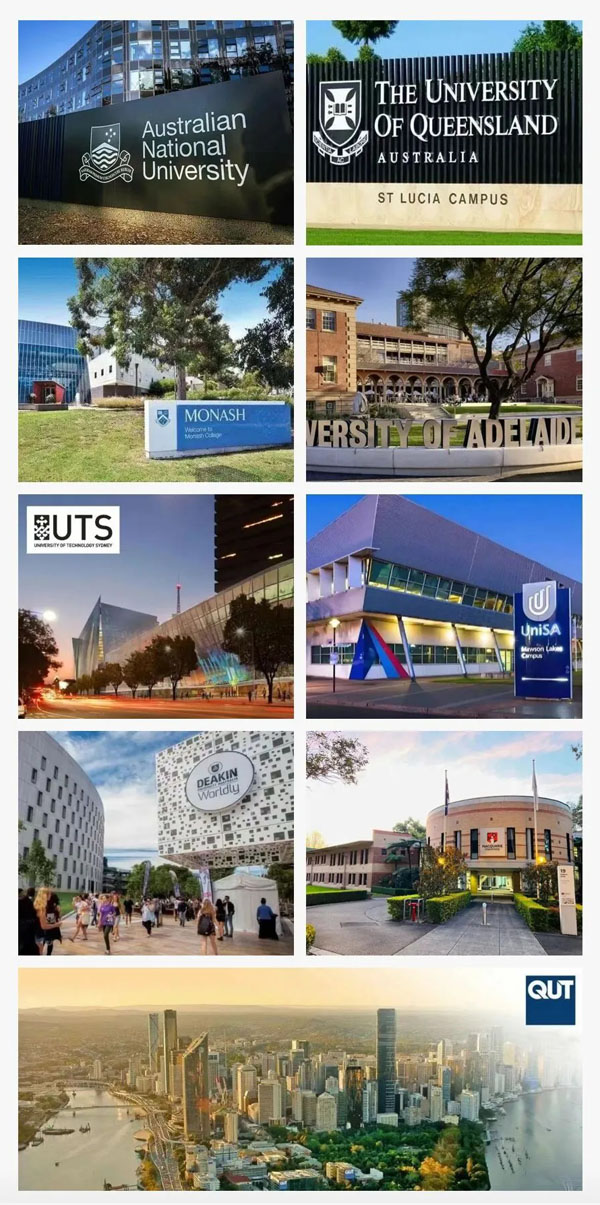 澳大利亚国立大学、蒙纳士大学、昆士兰大学、阿德莱德大学、悉尼科技大学、麦考瑞大学、昆士兰科技大学、迪肯大学、南澳大学等