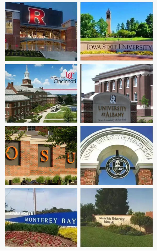 罗格斯大学、爱荷华州立大学、辛辛那提大学、俄克拉荷马州立大学、纽约州立奥尔巴尼大学、宾夕法尼亚印第安纳大学、加州州立蒙特利湾大学等