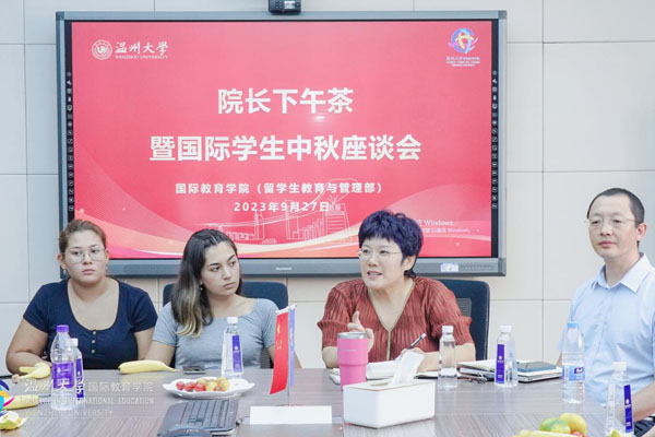 在中秋节来临之际,为进一步强化我校国际学生教育教学管理,畅通学院与学生之间的沟通交流,传递学院的温暖关怀之情。9月27日下午,国际教育学院于3-311会议室举办院长下午茶暨国际学生中秋座谈会。温州大学国际与交流合作处副处长郑婷,国际教育学院宋占美院长、熊勇副院长、方建晓副书记、辅导员以及20余名国际学生代表参与本次活动。本次活动由方建晓副书记主持。