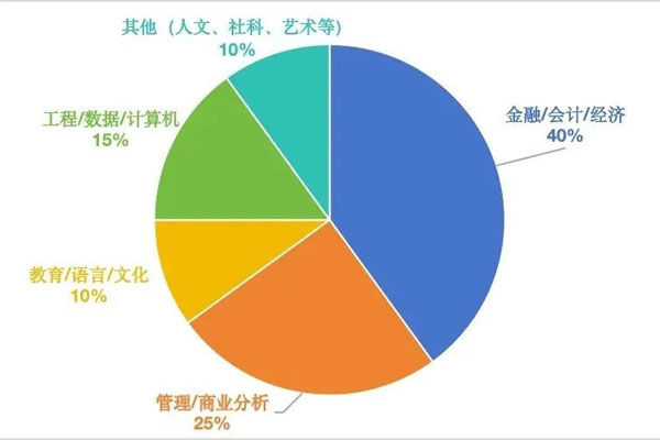 金融、会计与经济作为最热门的方向,涵盖传统与细分领域如金融科技、能源经济等,显示院校专业设置日趋精细化。管理与商业分析(约25%)同样备受关注,尤其是商业分析(BA)成为跨学科申请的热点。